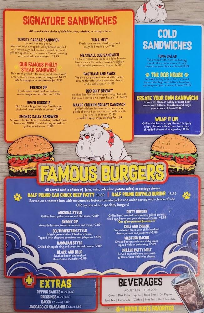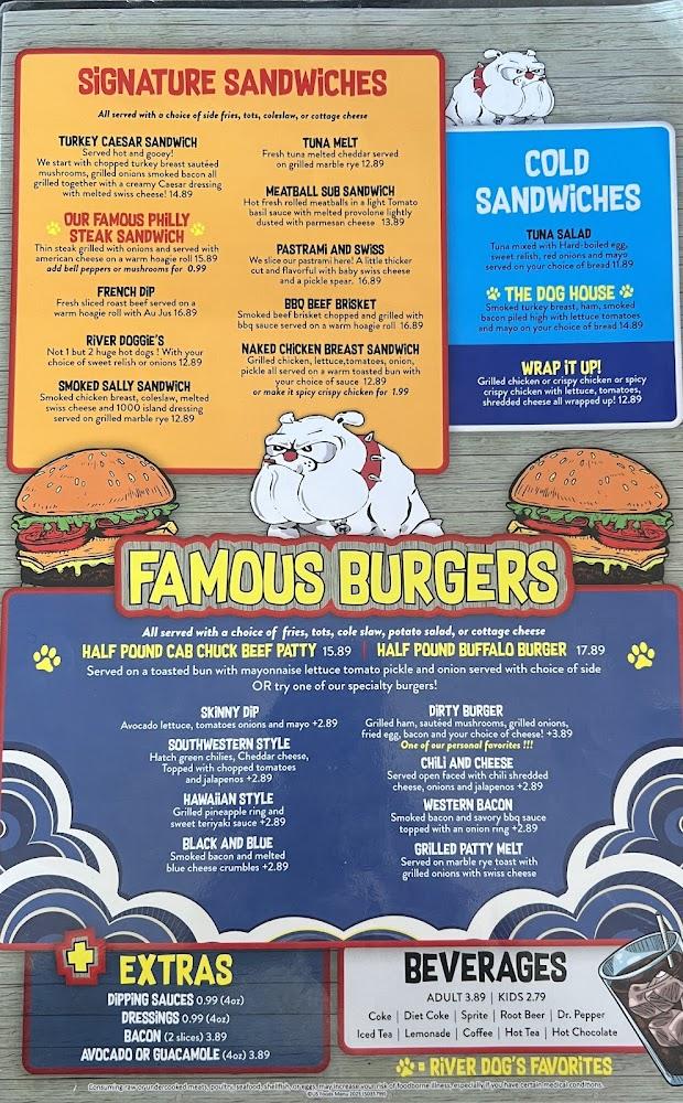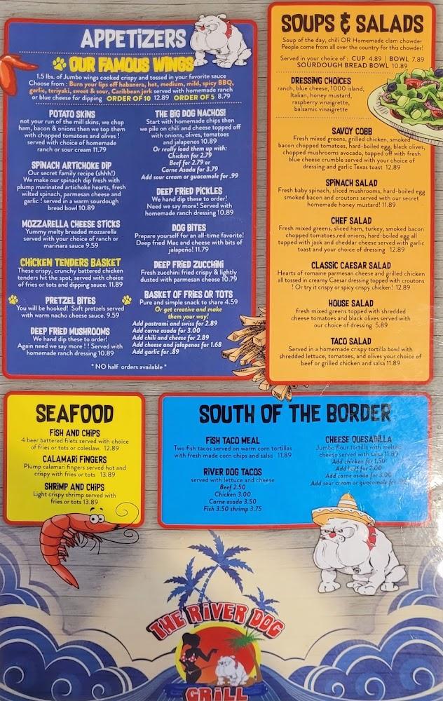 The River Dog Grill features a well-rounded menu catering to diverse tastes. From hearty burgers to vibrant salads, the options are plentiful. Signature dishes include the famous Philly cheese steak and crispy fried shrimp. There's something to satisfy every palate.